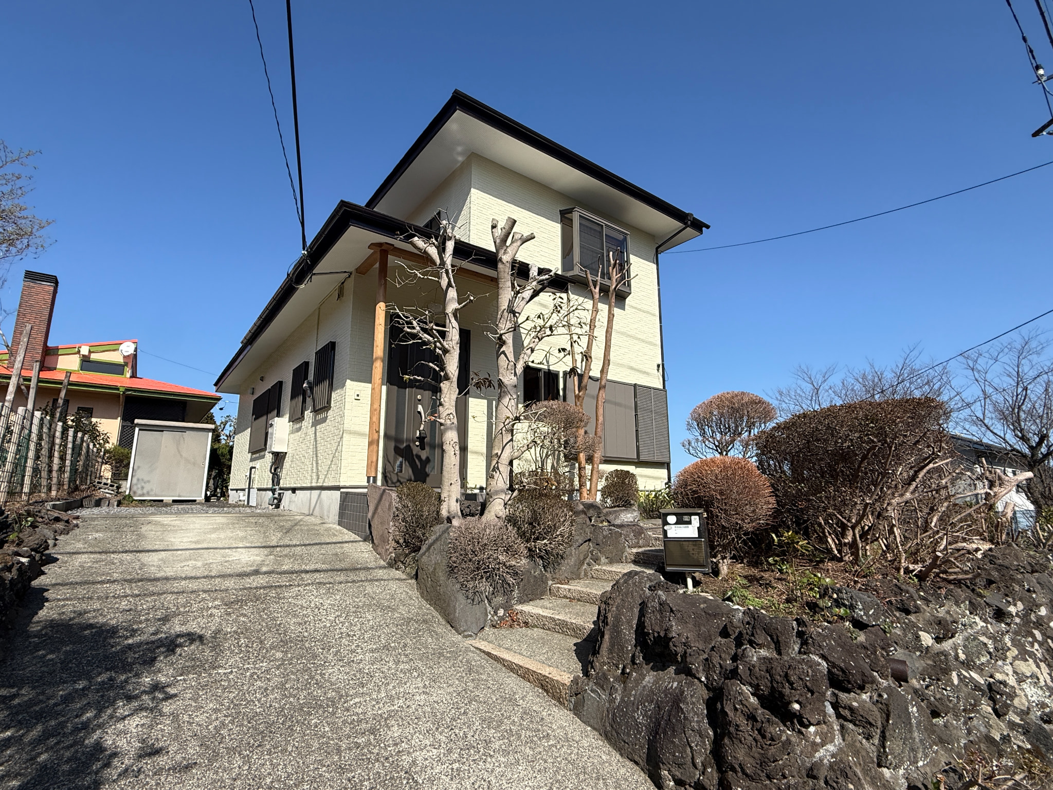 伊豆高原駅徒歩圏、建物状態良好、駐車スペース複数台、コンパクトなお庭と海眺望、小さなカフェや事務所兼住宅にもお勧め